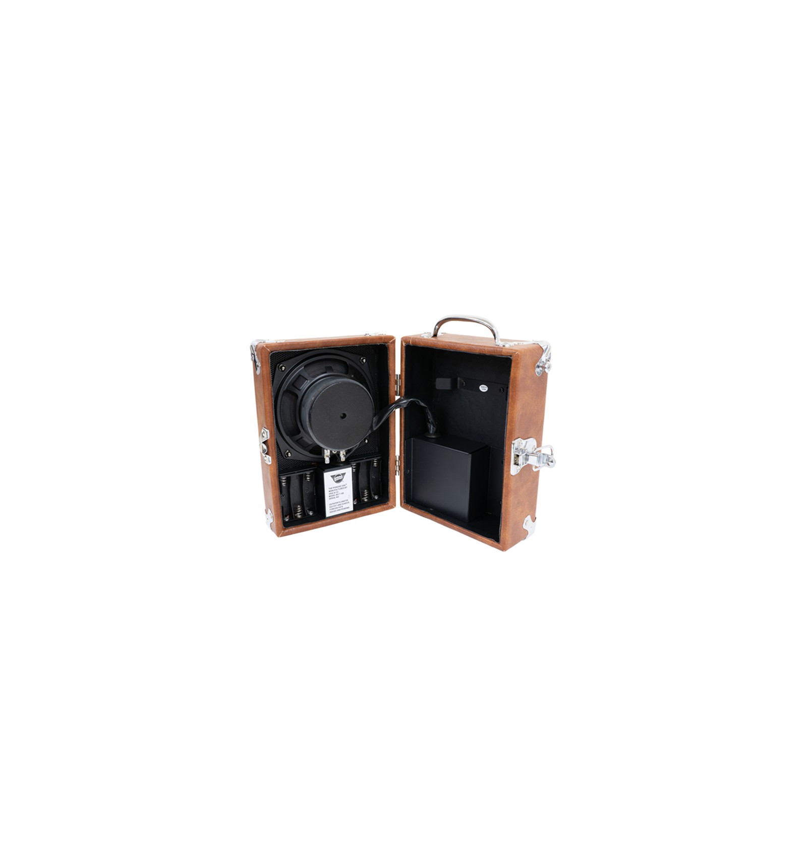 Het stevige houten kastje is afgewerkt met metalen hoeken en een robuuste bekleding, waardoor hij jaren meegaat. De versterker werkt op 6 AA-batterijen (niet inbegrepen) of via een optionele 9V-adapter. Handig detail: de adapter past netjes in de binnenkant van de behuizing, zodat je alles compact kunt meenemen. Met een gewicht van slechts 1,9 kg en een draagriemlus is deze amp letterlijk overal inzetbaar.